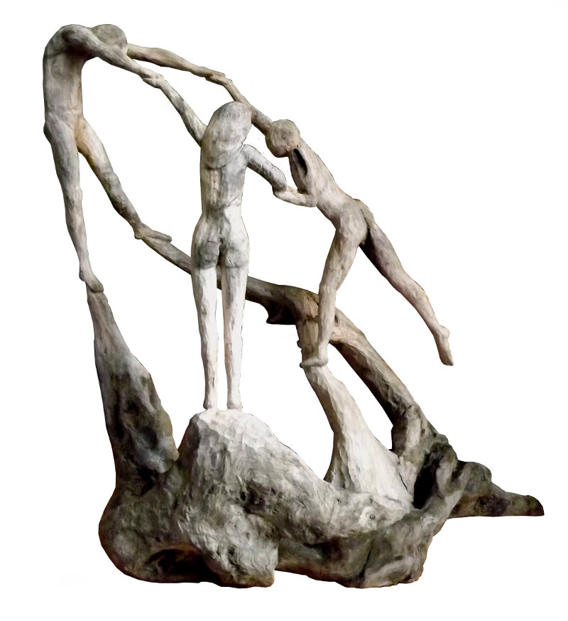 Cette sculpture, haute d’environ 45cm, est une pièce unique créée à partir d’un souche de bois flotté dont les formes et les creux ont inspiré la création. Plusieurs interprétations peuvent être en être faites. Les postures des personnages rappellent la peinture « La Danse » d’Henri Matisse.